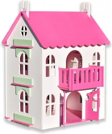 Нежно-розовый деревянный кукольный домик Wood lines «Арина» как будто появился из детских снов о сказочном доме принцессы - два этажа, арочные окна, колонны, балкон – все так и просит скорее заселить волшебный дом жильцами-куклами и начать игру.