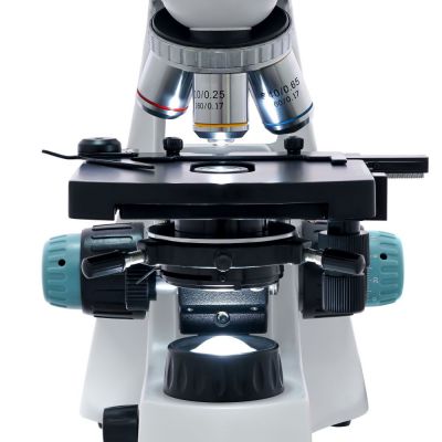 Насадку микроскопа можно вращать, что удобно при работе в группе. Визуальный блок имеет небольшой наклон в 30° – это делает длительную работу с микроскопом более комфортной. 10-кратные окуляры обеспечивают хороший обзор, а ахроматическая оптика четко и ясно передает все детали мелких структур. В револьверное устройство установлены объективы с увеличением 4х, 10х, 40х и 100х. Общее увеличение микроскопа составляет от 40 до 1000 крат. Обратите внимание, что микроскоп позволяет применять метод масляной иммерсии – для этого используется 100-кратный объектив. Кроме того, у объективов 40х и 100х есть защитные пружинящие оправы.