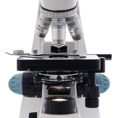 Насадка состоит из бинокулярного визуального блока (он имеет небольшой наклон в 30°) и отдельно расположенной вертикальной трубки (в нее можно установить цифровую камеру). Насадка вращается, что делает работу в лаборатории более удобной. Окуляры широкопольные и дают увеличение в 10 крат. Ахроматические объективы уже установлены в револьверное устройство. 40-кратный и 100-кратный объективы имеют защиту передней линзы – специальную пружинящую оправу. 100-кратный объектив используется для масляной иммерсии. Оптическая схема микроскопа позволяет проводить исследования на увеличении от 40 до 1000 крат. Для настройки резкости применяется коаксиальный механизм грубой и точной фокусировки.