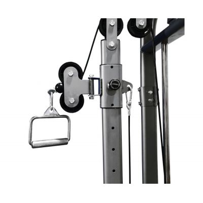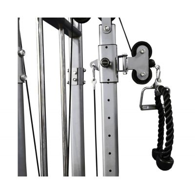Турник с нескользящими ручками, входящий в комплектацию, выдерживает вес до 100 кг. Положение рук широким хватом хорошо укрепляет спину, руки и плечевой пояс. В комплектацию входит канат для упражнений на трицепс и бицепс (сгибания, разгибания рук), мышцы плеч и кора (упражнение «священник»). Канат крепится к регулируемой по высоте каретке.