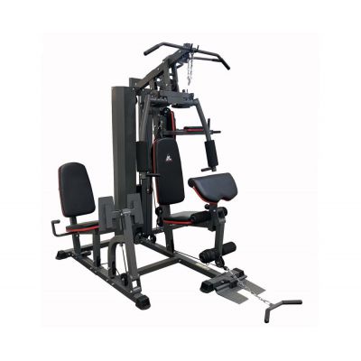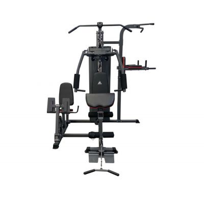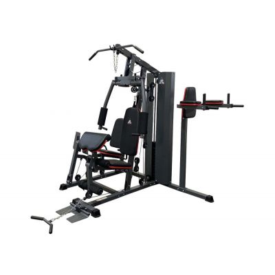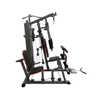 Многофункциональный тренажер с встроенным весовым стеком. Позволяет выполнять комплекс упражнений на различные группы мышц. Дополнительно тренажер имеет брусья для отжимания и скамью для пресса с гантелями по 1,5 кг с регулировкой по углу наклона.