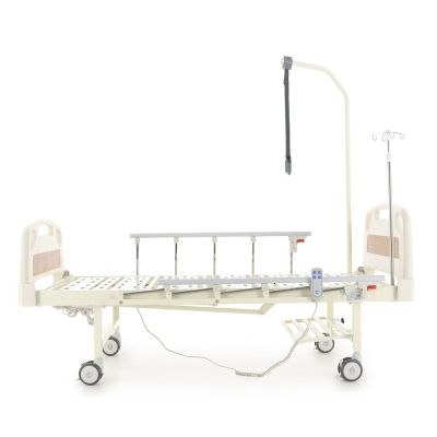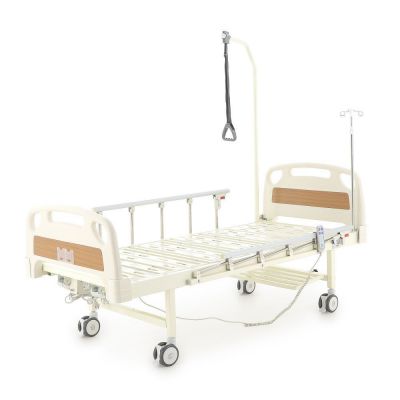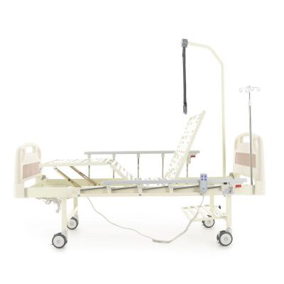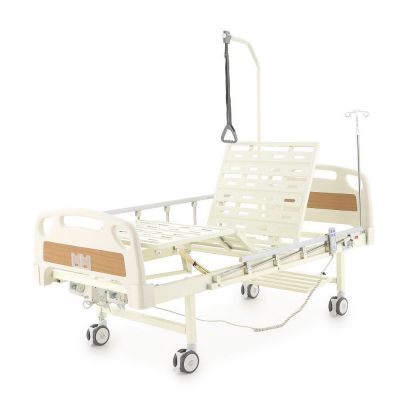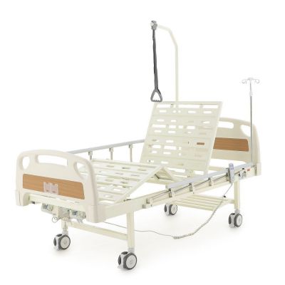 Кровать медицинская функциональная с электроприводом регулировки положения секций. Четырехсекционная медицинская функциональная кровать с электроприводом регулировки секций. Полная комплектация: штанга для подтягивания, боковые ограждения и инфузионная стойка. Быстросъёмные спинки кровати выполнены из ABS-пластика, со вставками из ламината под дерево и защитными бамперами.