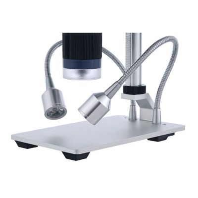 Интересным образом устроена подсветка. Несколько светодиодов находятся внутри объектива – это классическое верхнее освещение для наблюдений в отраженном свете. Также рядом расположены два светодиода на гибких держателях, которые можно отклонять под разными углами и более точно выстраивать освещение рабочей области. Яркость подсветки регулируется.