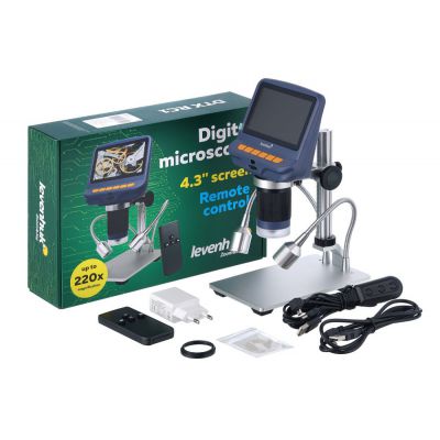 Вместо классических окуляров здесь установлен цветной ЖК-экран с диагональю 4,3 дюйма (около 11 см). Он захватывает изображение с объектива и показывает его в реальном времени. При необходимости картинку можно вывести и на экран монитора – для этого необходимо подключить микроскоп к компьютеру при помощи комплектного USB-кабеля. Для исследований образцов можно использовать оптическое или цифровое увеличение. Общий диапазон кратности составляет от 3 до 220 крат. Также микроскоп позволяет делать фото в высоком разрешении и записывать видео в Full HD качестве (требуется карта памяти, в комплект поставки не входит).