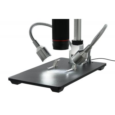 Подсветка состоит из двух светодиодов, яркость которых можно регулировать. Они закреплены на гибких держателях, с помощью которых свет можно направить на объект наиболее точно. Управление подсветкой (яркость, включение и выключение) осуществляется с небольшого переключателя на кабеле питания.