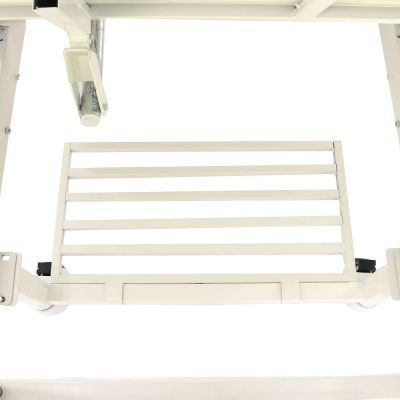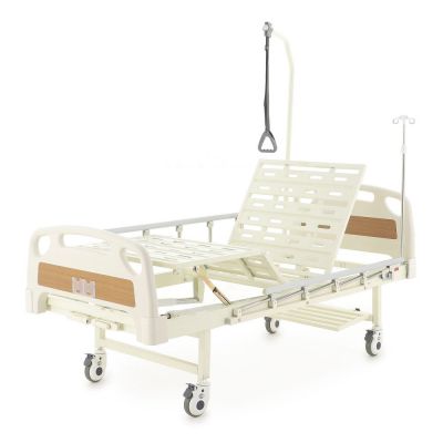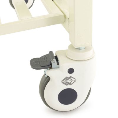 Регулировка головной и тазобедренной секций осуществляется 2-мя механическими приводами с червячной передачей. Колеса кровати имеют стальные несущие части, 2 колеса с индивидуальными педальными тормозами.