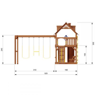 Все элементы и детали конструкции изготовлены из прочной древесины сосны с пропиткой от гниения и разрушения. Пластиковые аксессуары не теряют яркости цвета под воздействием солнца и не трескаются на морозе.