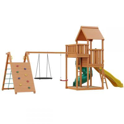 Игровая площадка изготовлена из клееного соснового бруса и массива сосны. Дерево обработано безопасной декоративно-защитной пропиткой.