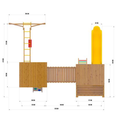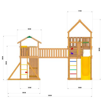 Детский игровой комплекс Jungle Palace Делюкс JB2. Выполнен из качественного дерева - клееный брус сосны. Дерево тщательно отшлифовано, покрыто защитным покрытием. В составе комплекса две башни с крышей, модуль мост, скалолазный модуль, рукоход, пластиковая горка 2,7 м.