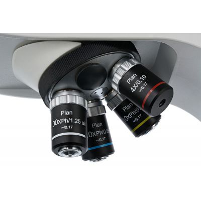 Револьверное устройство позволяет устанавливать до пяти объективов, но обратите внимание, что в комплект поставки включены только четыре объектива разной кратности. Это фазовые планахроматические объективы, выравнивающие поле зрения, улучшающие цветопередачу и уменьшающие оптические искажения. Два объектива с наибольшим увеличением имеют пружинящие оправы для защиты от случайных повреждений. Для масляной иммерсии используется 100-кратный объектив. Все оптические поверхности комплектных аксессуаров защищены антигрибковым покрытием.