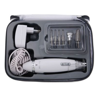 Плавная регулировка позволяет самостоятельно выбирать количество оборотов нажатием кнопок „плюс“ (+) и „минус“ (-). Начинают работу каждый раз с малых оборотов и повышают скорость только при необходимости. Дополнительно оснащен защитным колпачком для сбора ногтевой пыли.