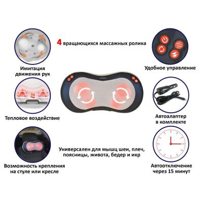 | Оптимально подходит как: | автомобильные, для шеи, для спины, шиацу, с подогревом, роликовые |