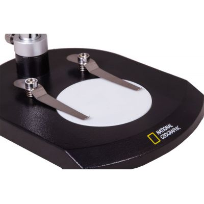 Предметный столик – это двусторонняя черно-белая пластина. Благодаря этому рассматривать через микроскоп можно как светлые или белые, так и очень темные объекты. Передаваемое изображение получается четким и контрастным.