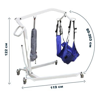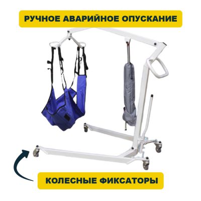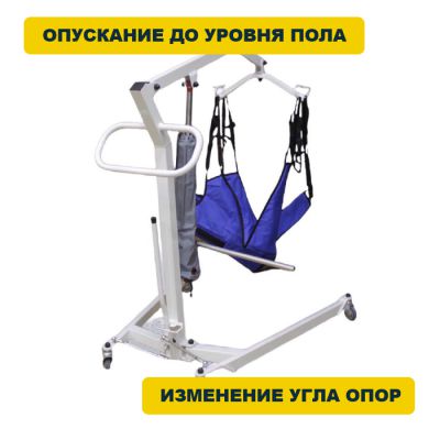 Низкие опоры подъемника дают возможность подъезжать вплотную к различным бытовым предметам. Изменяемый угол развода опор. Возможность опустить человека до уровня пола. Колесные опоры имеют фиксаторы.