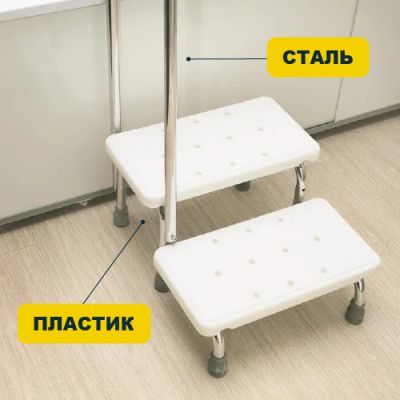 Рама выполнена из хромированной стали и не подвергается коррозии. Резиновые наконечники на всех ножках препятствуют скольжению, не оставляя следов на поверхности и обеспечивают безопасность пациента. Ступени выполнены из высокопрочного пластика.