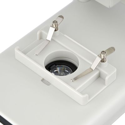 Предметный столик освещается с двух сторон – сверху и снизу. Это позволяет исследовать образцы любой степени прозрачности. Для фиксирования микропрепаратов используются металлические зажимы. Небольшой набор с готовыми образцами включен в комплект поставки.