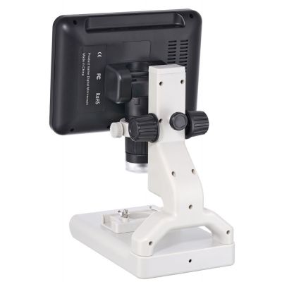 Увеличение микроскопа составляет от 10 до 200 крат, оптическая его часть – от 10 до 50 крат. Картинка с объектива выводится на встроенный цветной экран с диагональю 7 дюймов (около 18 см). Изображение четкое и хорошо читаемое. Под экраном расположены кнопки управления, также они продублированы на дистанционный пульт. С пульта можно регулировать яркость подсветки, выбирать наиболее подходящее для наблюдений увеличение, делать фото, записывать видео и многое другое.