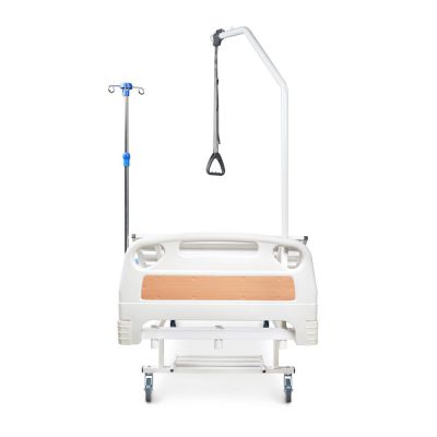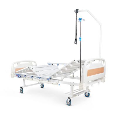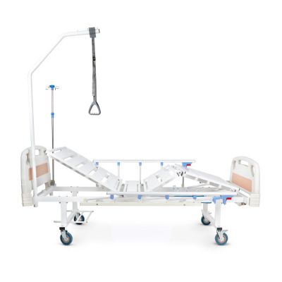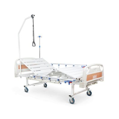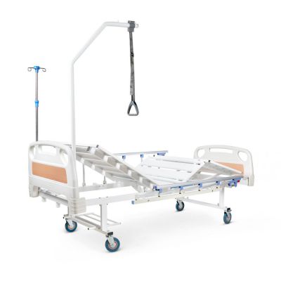 Высота ложа и регулировка секций производится механическим приводом. Наличие колес с индивидуальными тормозами облегчает передвижение кровати внутри помещений.